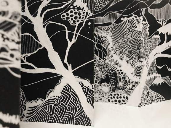 A series of Moleskine leporellos and Chinese handmade accordion books drawn as if the line were a thread to be woven. These are the artist's travelling companions, and their common feature is becoming. The water becomes a host of fishes, which become a bunch of roots, which become a mass of clouds. The length of the book allows a full display of marvels, each born in the slow meditation of the artist's drawing hand.